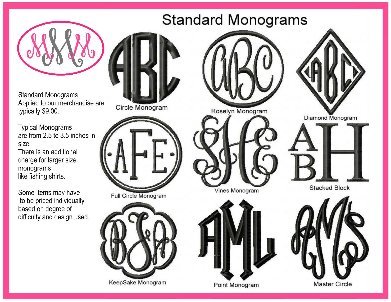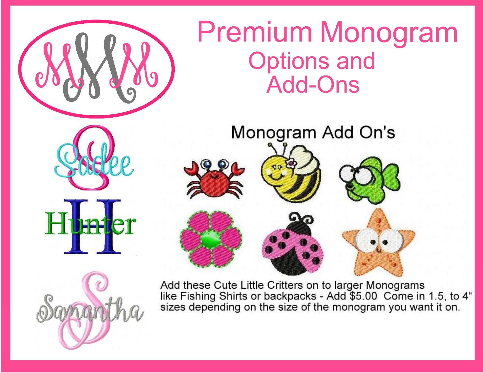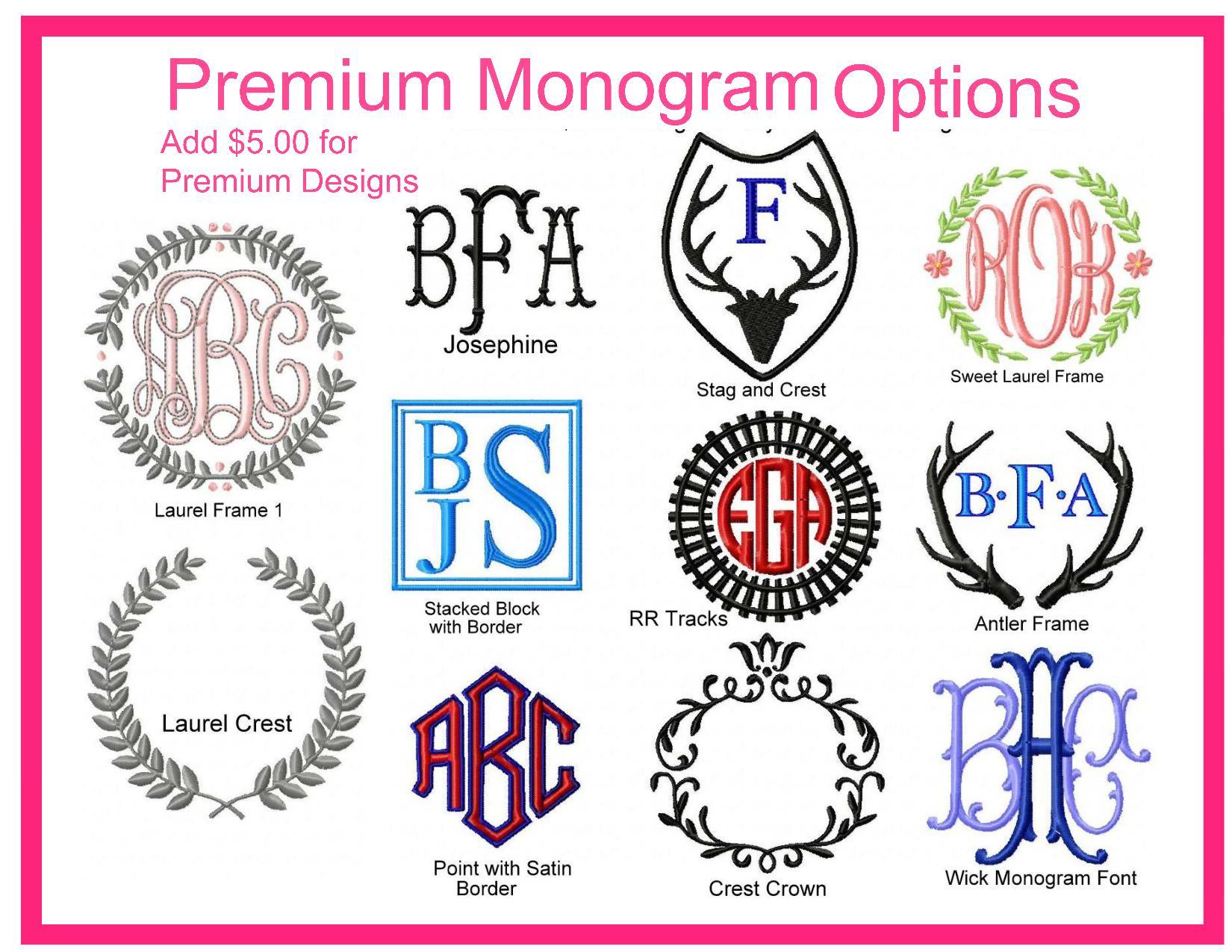 This item comes monogrammed, See pictures of monogramming options and styles - some are premium options - should you choose any of those options - please add the premium monogramming listing to your cart as well.