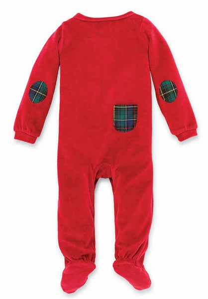 Footed velour one-piece has plaid necktie applique, elbow patches and back pocket detail. Button closures at shoulder and snap closure at inner leg. this item does not come monogrammed, if you would like it monogrammed add the Listing standard Monogram or Premium Monogram to your cart with all the information.
