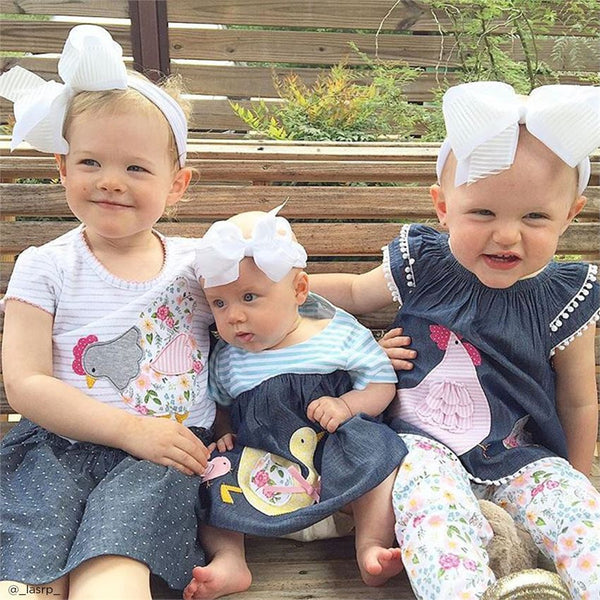 2-piece set. Chambray tunic features tiered ruffle sleeves with pom-pom trim, elastic neckline & interlock hen & chick appliques with dimensional wing petals, ribbon tail & embroidered details. Arrives with printed cotton spandex leggings. Sweet set to wear to school in the Spring and on vacation in the Summer!